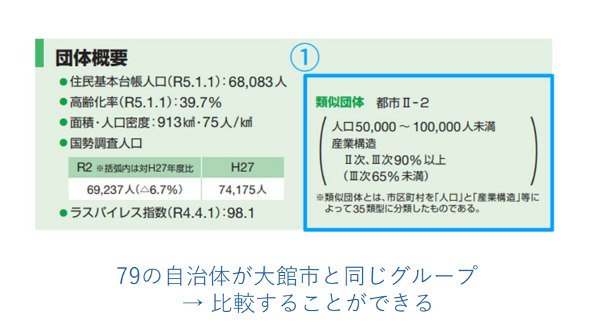 青枠で囲んだ箇所をご覧ください。国は、人口規模とどの産業に従事している人の割合が多いかを基準に、全国の自治体を35のグループに分けています。大館市は人口5万~10万人、2次産業と3次産業に従事する人の割合が90%以上(3次産業は65%未満)というグループに属しています。このグループには79の自治体が属します。これを類似自治体といいます。