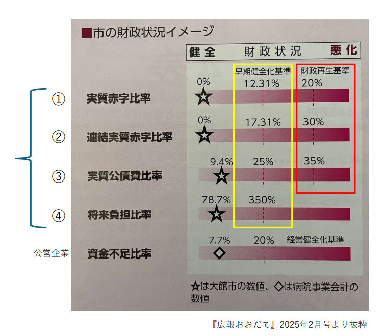 丸数字の4つの指標が「財政健全化判断比率」です。一番下は公営企業だけを抜き出したものです。☆印が大館市の令和5年度の実績値です。黄枠と赤枠は国の基準です。それぞれ信号の黄色信号と赤信号にあたります。